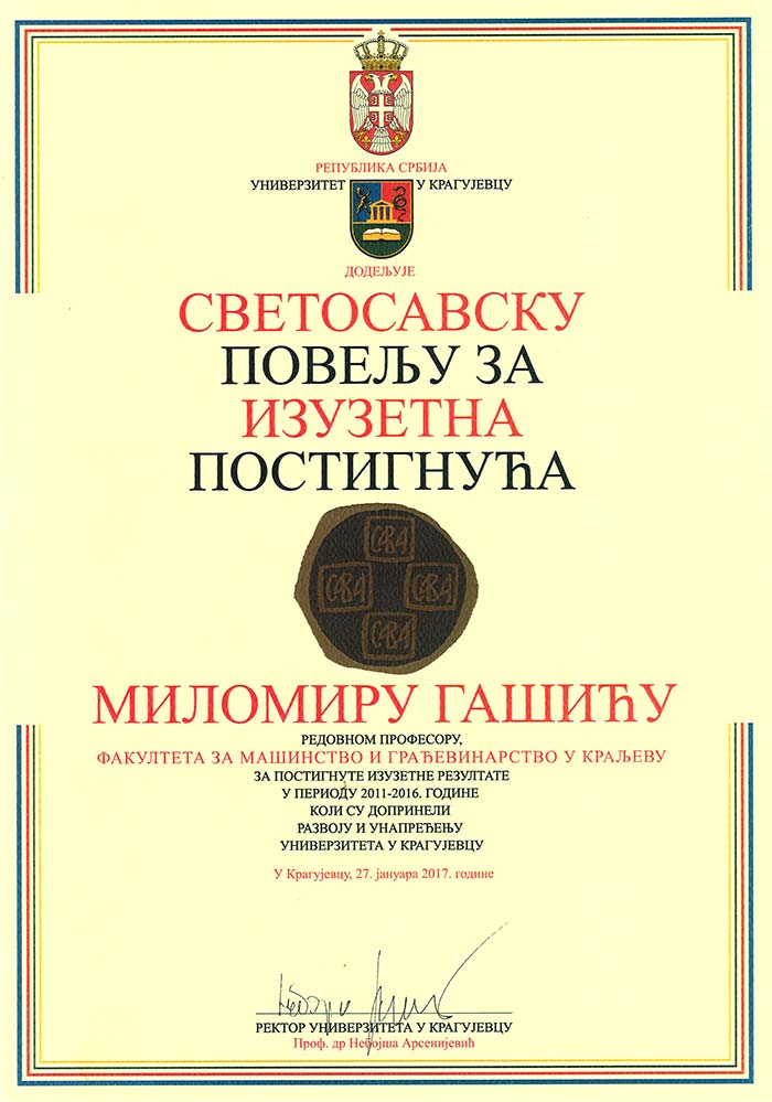 Povodom obeležavanja Svetog Save 27. januara 2017. god., Univerzitet u Kragujevcu je dodelio Svetosavsku nagradu za izuzetne rezultate i inovacije u oblasti nauke Milomiru Gašiću, redovnom profesoru Fakulteta za mašinstvo i građevinarstvo u Kraljevu.