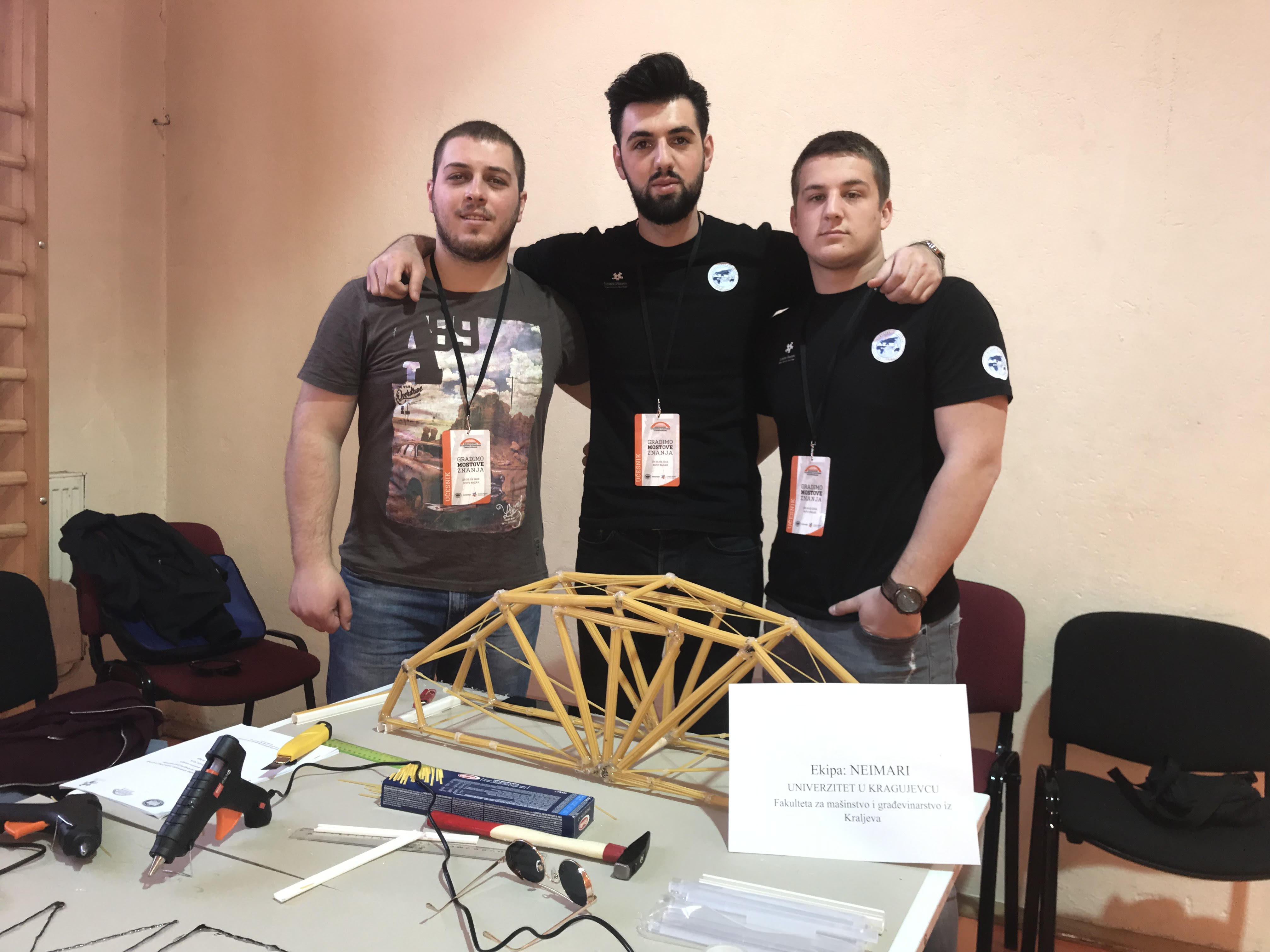 У току протеклог викенда у Новом Пазару је одржано међународно такмичење под називом "Градимо мостове знања". На овом традиционалном такмичењу по први пут су ове године учествовали и представници нашег факултета. Екипа "Неимара" коју су сачињавали Тарик Биберовић, Харис Браховић, Јанко Скорупан и Стефан Радотић су мостом од шпагета масе 1200 грама заузели екипно пето место. Наш Универзитет је заузео треће место у конкуренцији 12 универзитета.