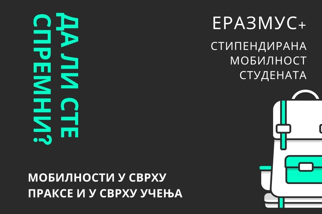 У жељи да студентима Универзитета у Крагујевцу приближимо информације о активним конкурсима за Еразмус+ програм мобилности студената у сврху учења и сврху праксе, Универзитет у Крагујевцу одржаће онлајн презентацију Еразмус+ програма мобилности, у среду, 17. марта 2021. године са почетком у 12 сати.